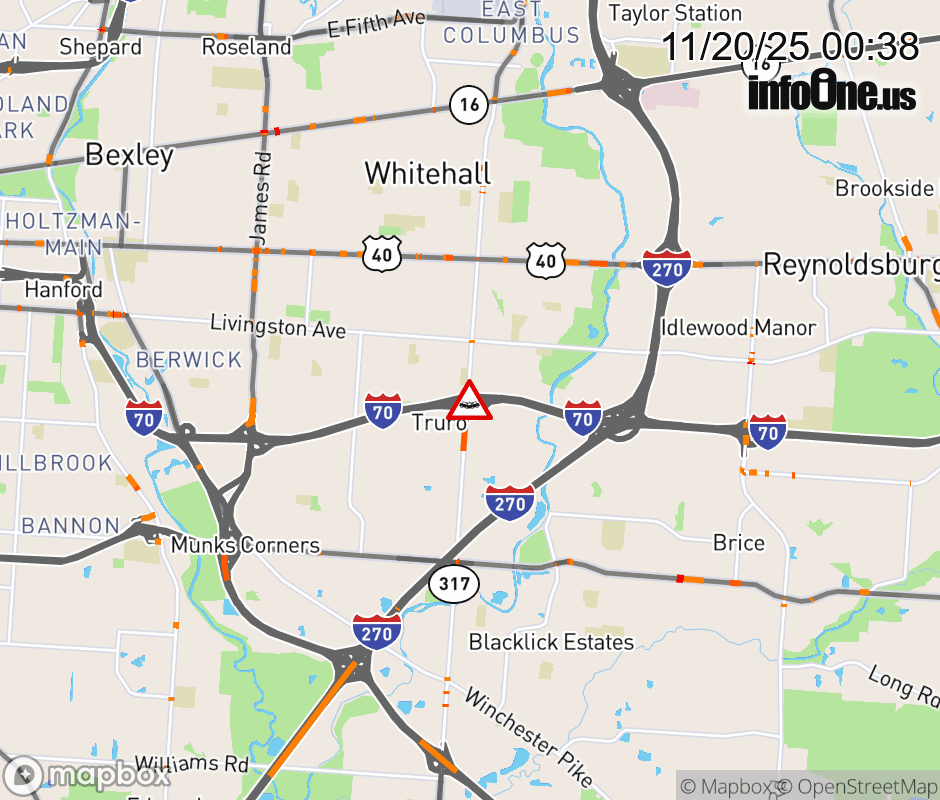 The 2 left lanes are blocked on I-70 West beyond SR-317/Hamilton Rd, due to a crash. Updated: Thu 11/20/25 12:38 AM EST ![]() Updated: Thu 11/20/25 12:38 AM EST |