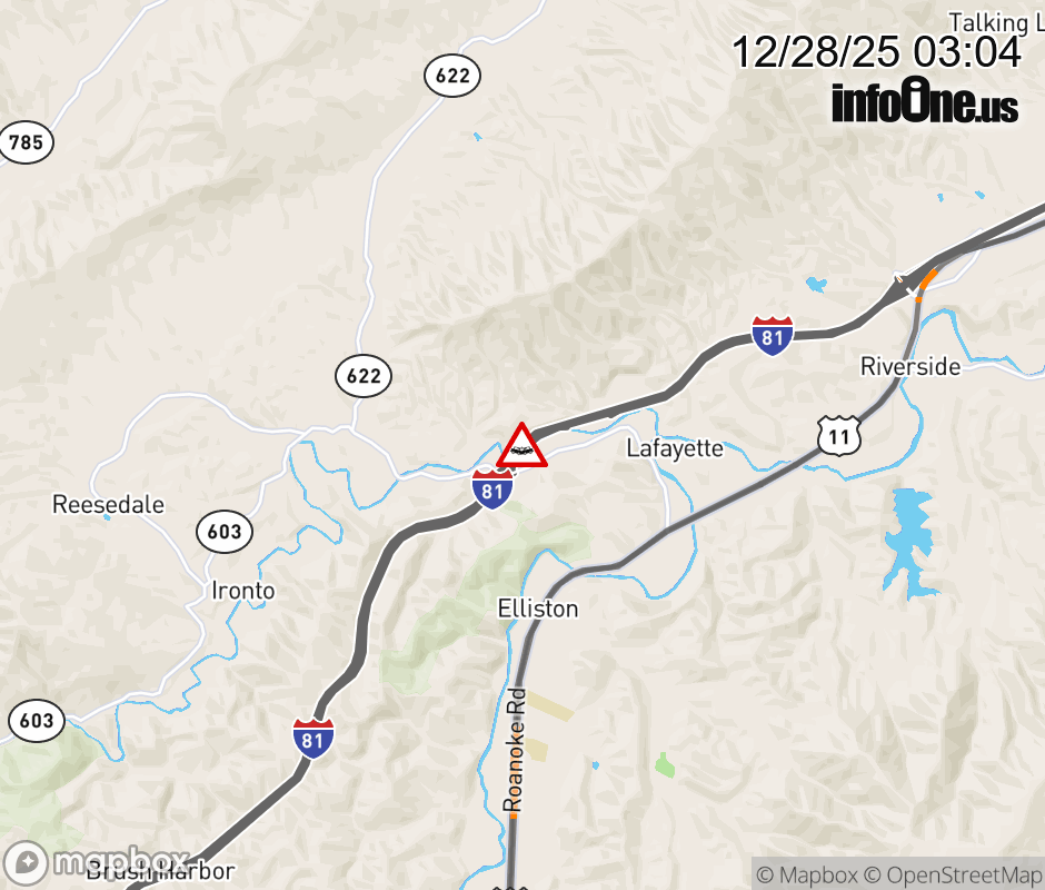 On I-81 at mile marker 128.5 in the County of Montgomery, motorists can expect delays due to a vehicle crash. The south left shoulder and left lane are closed. ![]() |