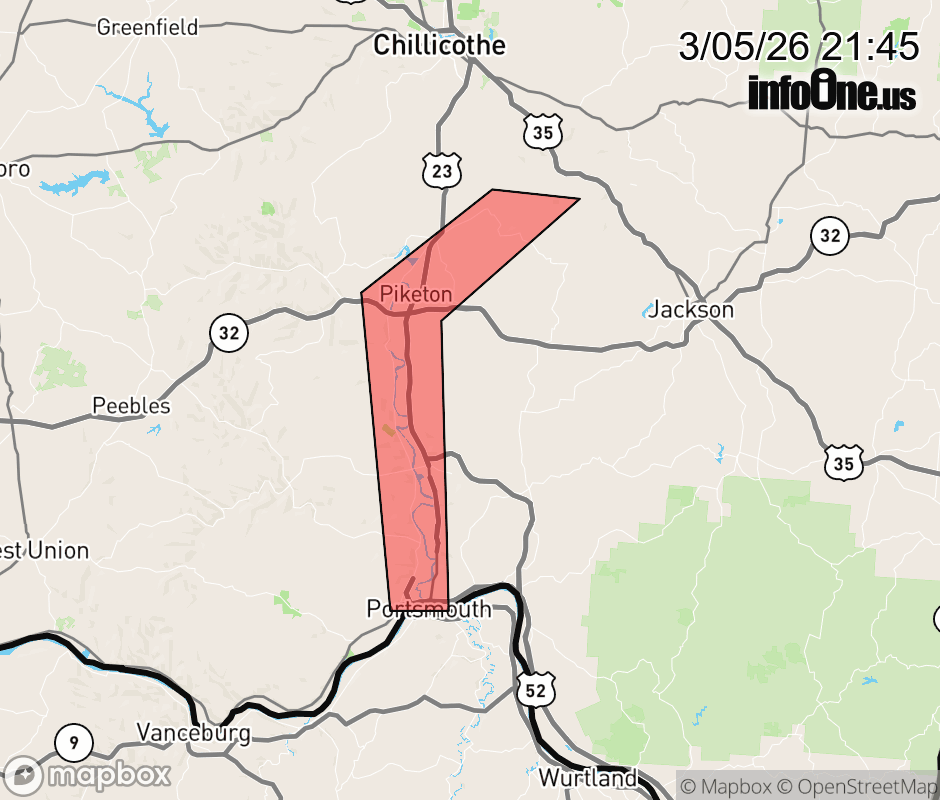 Flood Warning issued March 5 at 9:44PM EST until March 8 at 8:00AM EDT by NWS Wilmington OH ...The Flood Warning continues for the following rivers... Scioto River at Piketon. * WHAT... Minor flooding is forecast. * WHERE... Scioto River at Piketon. * WHEN... Until Sunday morning. * IMPACTS... At 21 feet, several roads near the river are flooded, including county roads along creeks emptying into the Scioto River. Ohio Route 220 at River Road is flooded south of Waverly. Scioto and Camp Creek Townships in southern Pike County are most impacted. * ADDITIONAL DETAILS... - At 9:00 PM EST Thursday the stage was 19.5 feet. - Forecast...The river is expected to rise above the flood stage of 20 feet by midnight tonight, reaching a crest of 20.6 feet early Friday afternoon. The crest will remain long- lived and only drop to below flood stage near midnight Saturday night. - Flood stage is 20 feet. ![]() |
