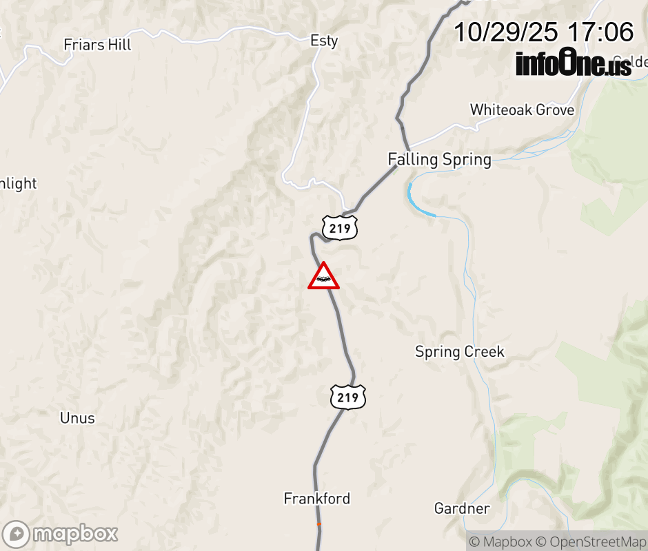 Vehicle Crash on US-219(between Friars Hill Rd./Butler Mtn.Rd,). The northbound road is closed. Updated: Wed 10/29/25 5:06 PM EDT ![]() Updated: Wed 10/29/25 5:06 PM EDT |