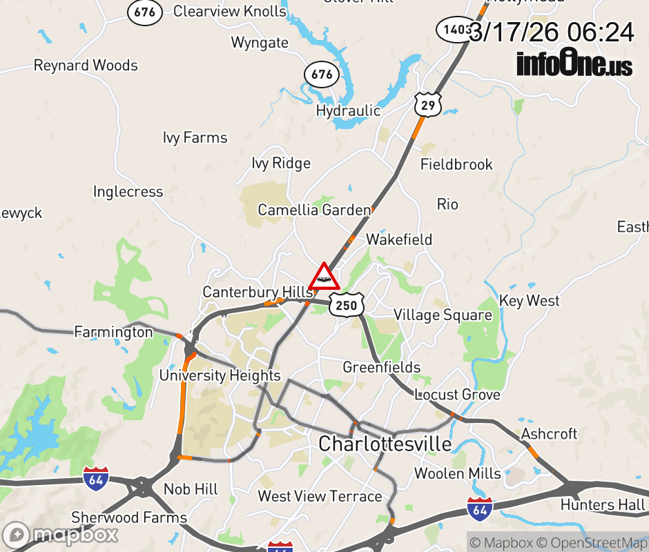 On US-29 in the County of Albemarle, in the vicinity of Hydraulic Rd; Rt. 743N/S (Albemarle County), motorists can expect delays due to a vehicle crash. The south right center lane, right lane, and right shoulder are closed. ![]() |