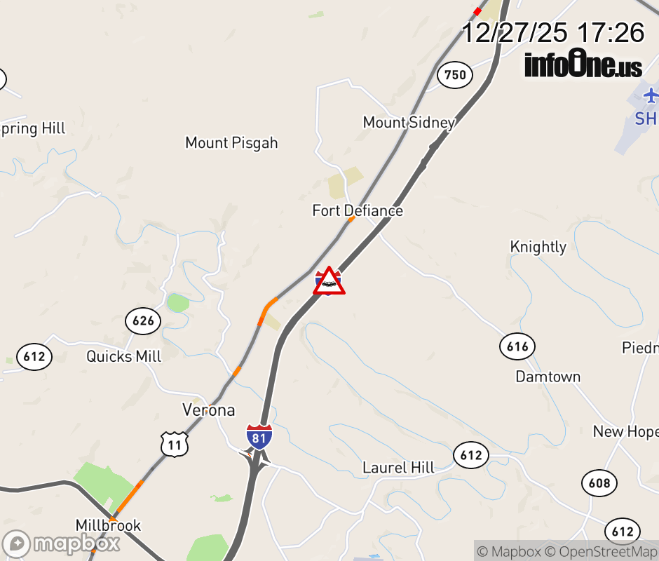 On I-81 South at mile marker 230.1 in the County of Augusta, motorists can expect delays due to a vehicle crash. Updated: Sat 12/27/25 5:26 PM EST ![]() Updated: Sat 12/27/25 5:26 PM EST |
