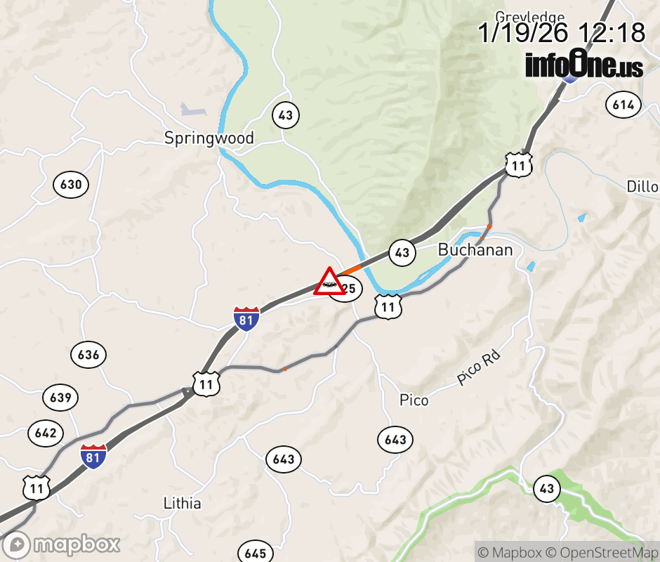 On I-81 at mile marker 164.6 in the County of Botetourt, motorists can expect delays due to a vehicle crash. The north left shoulder and left lane are closed. ![]() |