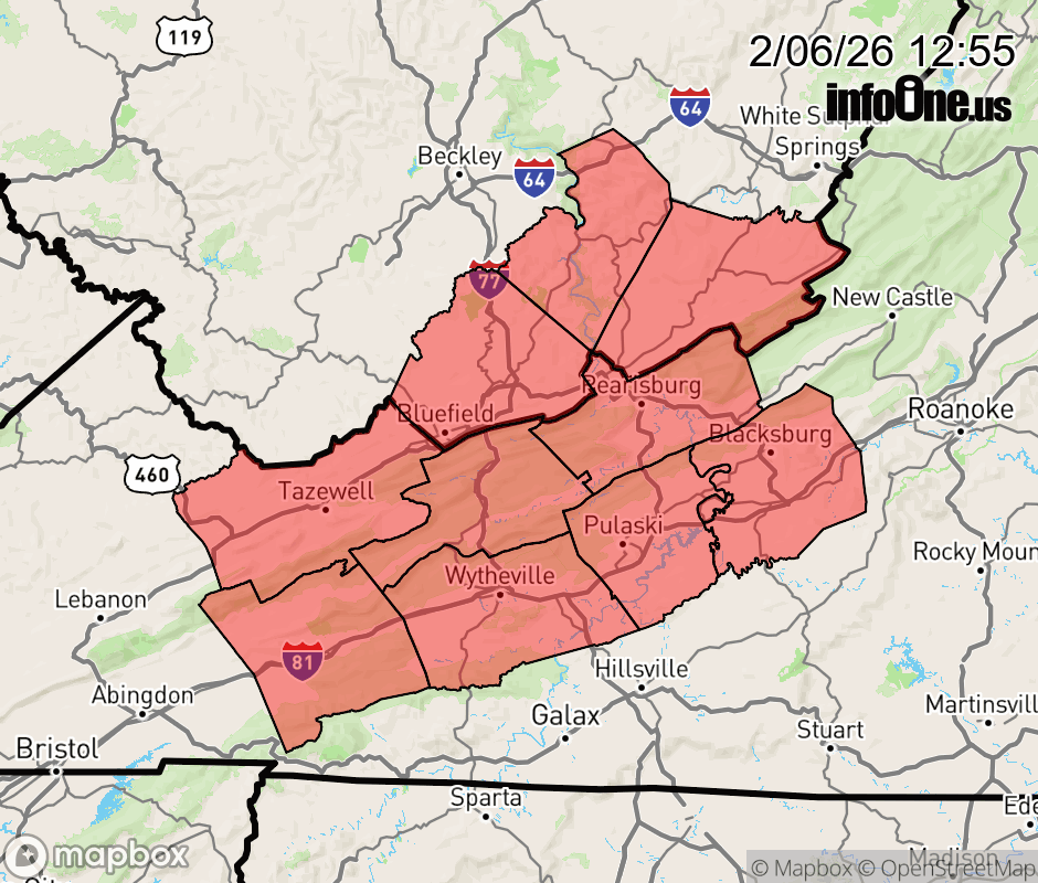 Wind Advisory issued February 6 at 12:54PM EST until February 7 at 7:00PM EST by NWS Blacksburg VA * WHAT... For the Wind Advisory, northwest winds 15 to 25 mph with gusts up to 50 mph expected. For the Cold Weather Advisory, very cold wind chills as low as 14 below expected. * WHERE... In Virginia, Bland, Giles, Montgomery, Pulaski, Smyth, Tazewell, and Wythe Counties. In West Virginia, Mercer, Monroe, and Summers Counties. * WHEN... For the Wind Advisory, from 7 PM this evening to 7 PM EST Saturday. For the Cold Weather Advisory, from 1 AM Saturday to 7 AM EST Sunday. * IMPACTS... Gusty winds will blow around unsecured objects. Tree limbs could be blown down and a few power outages may result. The dangerously cold wind chills as low as 20 below zero could result in hypothermia or frostbite if precautions are not taken. ![]() |