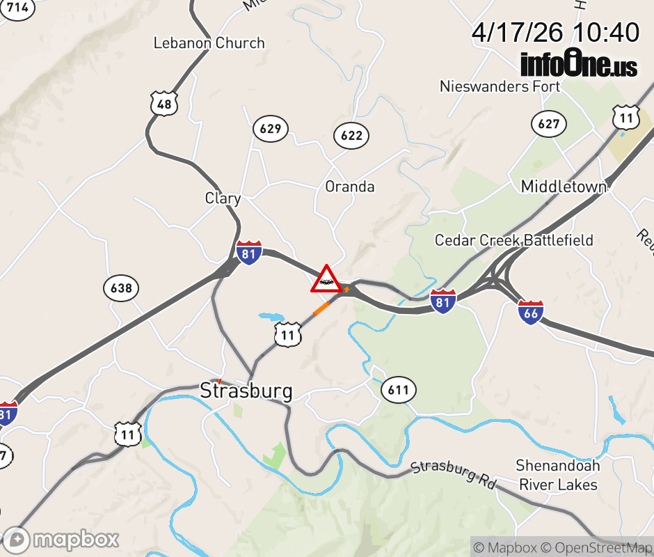 On I-81 at mile marker 298 in the County of Shenandoah, motorists can expect delays due to a vehicle crash. The south right shoulder is closed. ![]() |