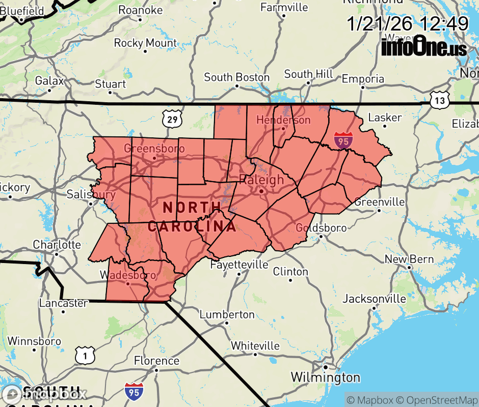 Canceled 1/22/26 12:54 AM Winter Storm Watch issued January 21 at 12:47PM EST until January 26 at 1:00PM EST by NWS Raleigh NC * WHAT... Heavy mixed precipitation possible. Confidence is increasing in widespread snow, sleet, and freezing rain. This may result in moderate to major impacts in infrastructure and transportation. * WHERE... The Piedmont and portions of the central and northern Coastal Plain. * WHEN... From Saturday afternoon through Monday afternoon. * IMPACTS... Roads, and especially bridges and overpasses, will likely become slick and hazardous. Significant ice accumulation on power lines and tree limbs may cause widespread and long-lasting power outages. ![]() |