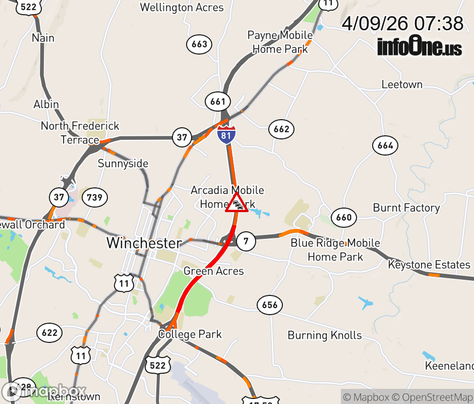 On I-81 North at mile marker 316.3 in the County of Frederick, motorists can expect delays due to congestion. Traffic backups are approximately 2.0 miles. Updated: Thu 4/9/26 7:38 AM EDT ![]() Updated: Thu 4/9/26 7:38 AM EDT |