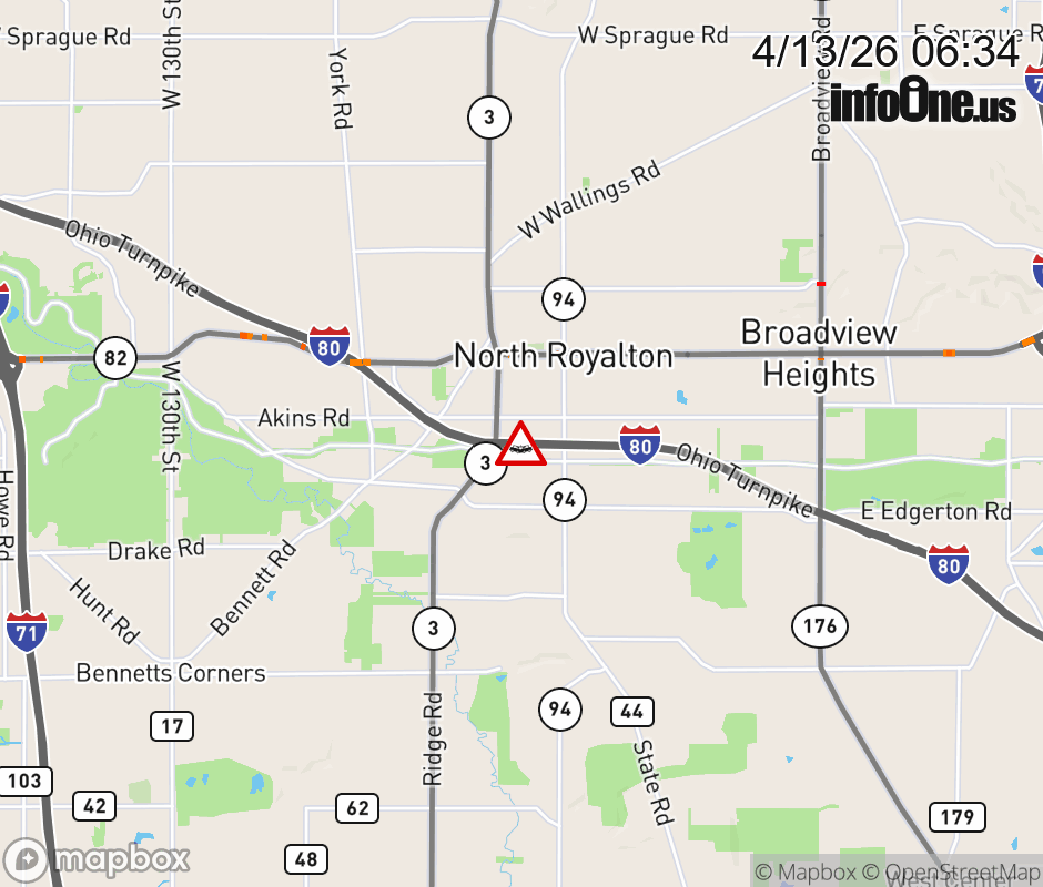 Expect lane closures on I-80 West (Ohio Turnpike) beyond I-77, due to a crash. ![]() |