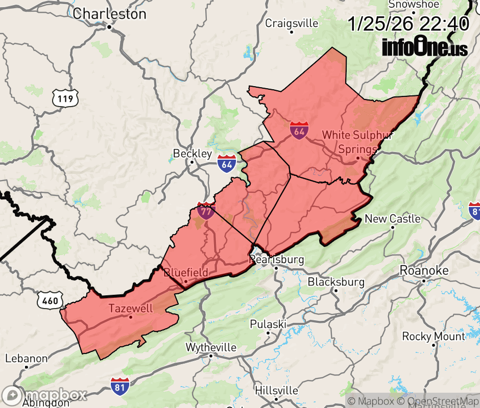 Winter Storm Warning issued January 25 at 10:39PM EST until January 26 at 1:00PM EST by NWS Blacksburg VA * WHAT... Heavy mixed precipitation. Additional snow accumulations up to one inch and ice accumulations around a light glaze. Winds gusting as high as 40 mph. * WHERE... Portions of southwest Virginia and southeast West Virginia. * WHEN... Until 1 PM EST Monday. * IMPACTS... Roads, and especially bridges and overpasses, will likely become slick and hazardous. Significant ice accumulation on power lines and tree limbs may cause widespread and long-lasting power outages. Plan on slippery road conditions. The hazardous conditions could impact the Monday morning commute. ![]() |