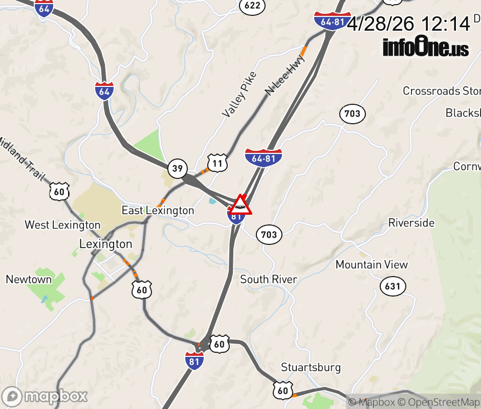 On I-81 at mile marker 191.4 in the County of Rockbridge, motorists can expect delays due to a vehicle crash. The south right lane and right shoulder are closed. Updated: Tue 4/28/26 12:14 PM EDT ![]() Updated: Tue 4/28/26 12:14 PM EDT |