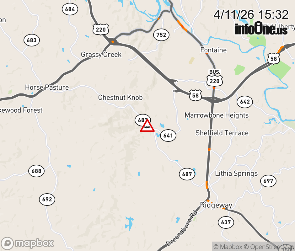 On Rt. 687 East in the County of Henry, in the vicinity of Joseph Martin Hwy; Rt. 641N/S (Henry County), motorists can expect delays due to a vehicle crash. Lane closures exist. Updated: Sat 4/11/26 3:32 PM EDT ![]() Updated: Sat 4/11/26 3:32 PM EDT |