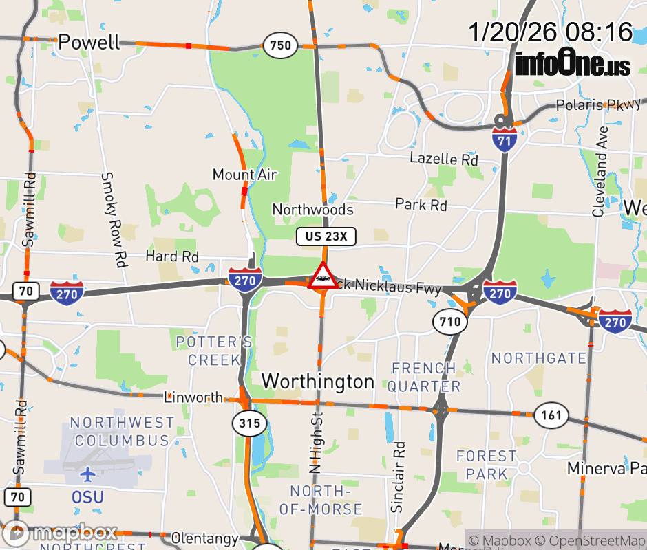 Expect lane closures on US-23 South at Ramp I-270 West to US-23 South, due to a crash. ![]() |