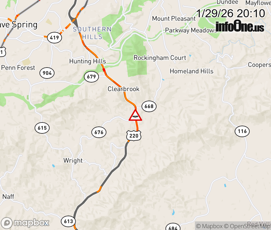 On US-220 South in the County of Roanoke, in the vicinity of Brethren Rd; Franklin Rd; FR-880N/S, motorists can expect delays due to a vehicle crash. Traffic backups are approximately 1.0 mile. Updated: Thu 1/29/26 8:10 PM EST ![]() Updated: Thu 1/29/26 8:10 PM EST |