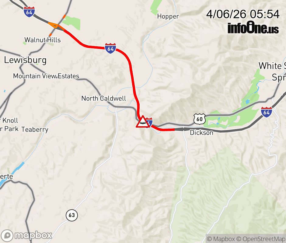 Vehicle Crash on I-64E at Mile Marker 174.0. Updated: Mon 4/6/26 5:54 AM EDT ![]() Updated: Mon 4/6/26 5:54 AM EDT |
