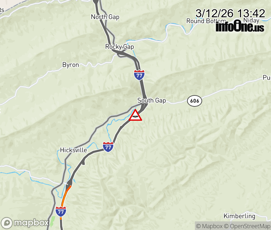 On I-77 at mile marker 62.1 in the County of Bland, motorists can expect delays due to a vehicle crash. The south right shoulder is closed. Updated: Thu 3/12/26 1:42 PM EDT ![]() Updated: Thu 3/12/26 1:42 PM EDT |