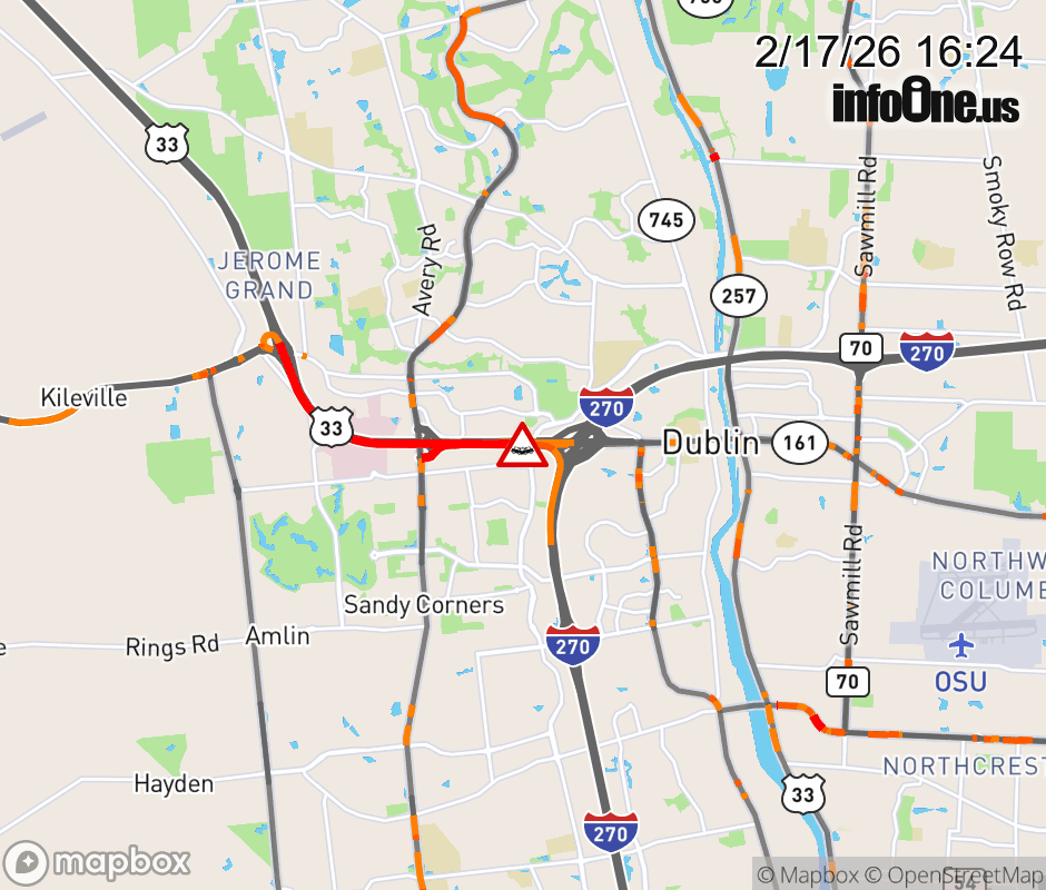 The left lane is blocked on US-33/SR-161 East at I-270, due to a crash. Updated: Tue 2/17/26 4:24 PM EST ![]() Updated: Tue 2/17/26 4:24 PM EST |