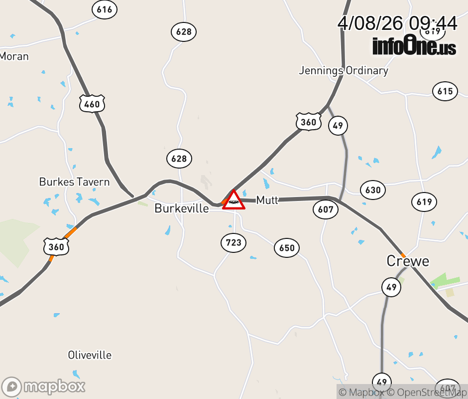On US-460 West in the County of Nottoway, in the vicinity of Lewiston Plank Rd; Rt. 723N/S (Nottoway County), motorists can expect delays due to a tractor trailer crash. ![]() |