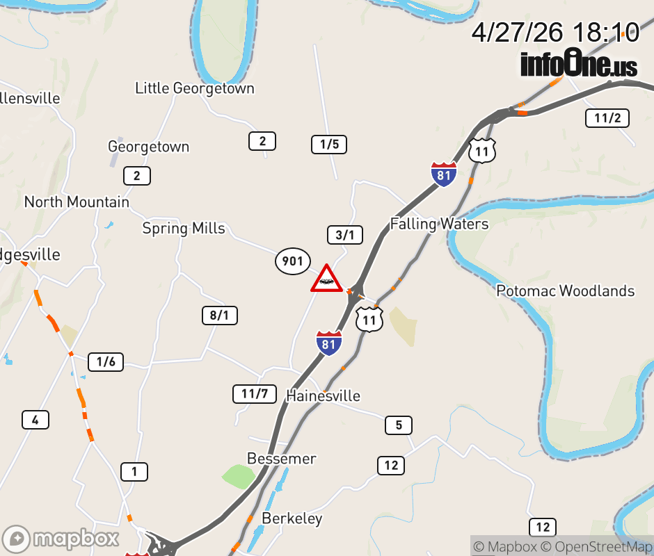Vehicle Crash on WV-901 (Hammonds Mill Dr) & CR-3/1 (Saint Andrews Dr) in Falling Waters. The eastbound road is closed. The westbound road is closed.