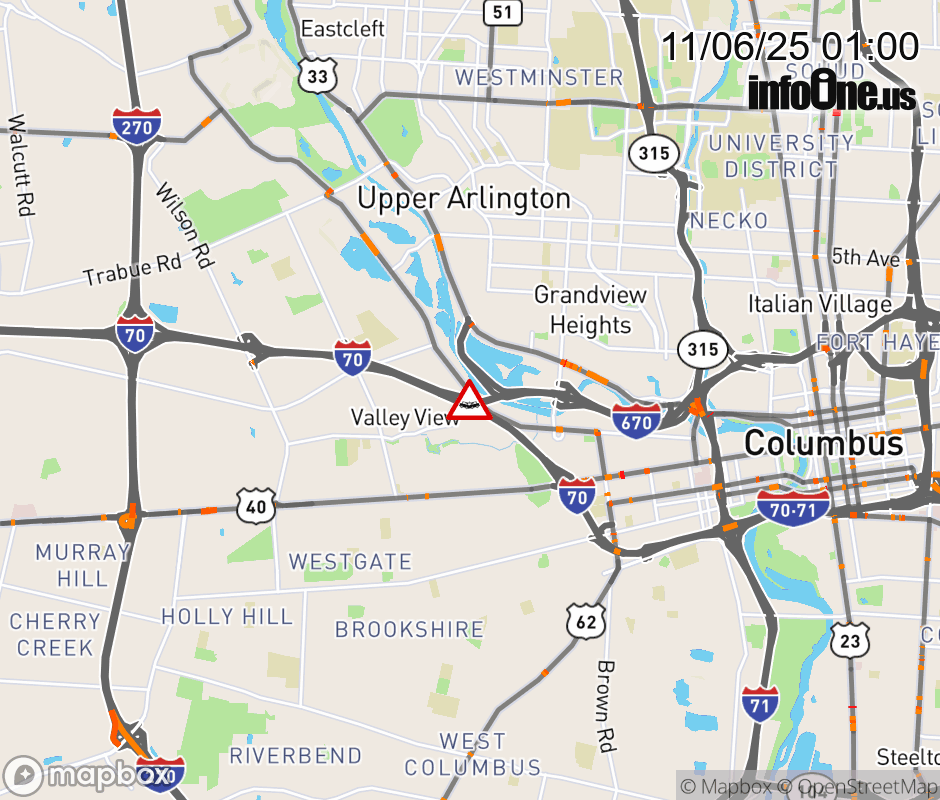 The right lane is closed on I-70 West beyond US-40/ W Broad St, due to a crash. Updated: Thu 11/6/25 1:00 AM EST ![]() Updated: Thu 11/6/25 1:00 AM EST |
