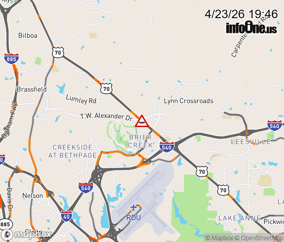 The two center lanes are closed at T.W Alexander Dr. Updated: Thu 4/23/26 7:46 PM EDT ![]() Updated: Thu 4/23/26 7:46 PM EDT |