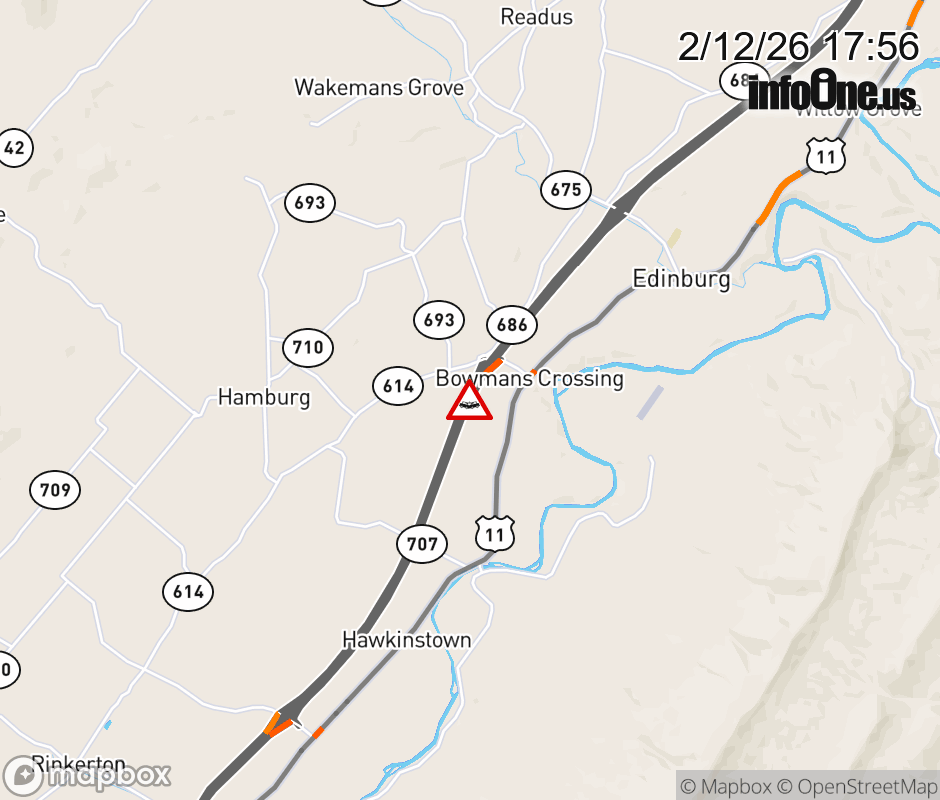 On I-81 at mile marker 277 in the County of Shenandoah, motorists can expect delays due to a vehicle crash. The north exit ramp narrows. Updated: Thu 2/12/26 5:56 PM EST ![]() Updated: Thu 2/12/26 5:56 PM EST |
