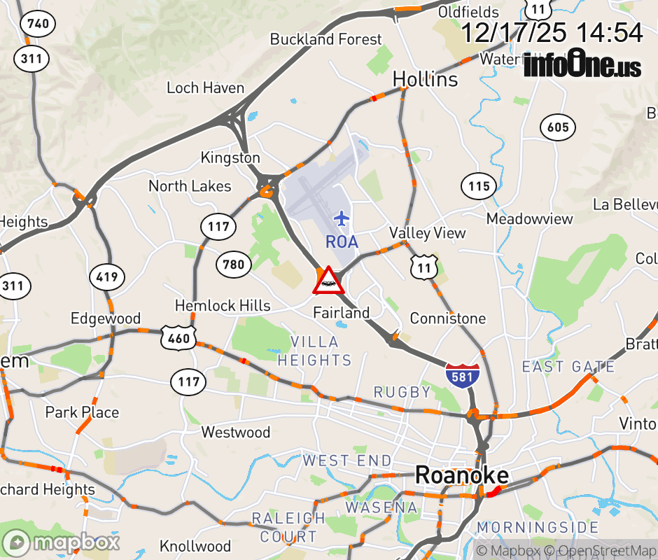 On I-581 at mile marker 4 in the County of Roanoke, motorists can expect delays due to a vehicle crash. The north right shoulder is closed. Updated: Wed 12/17/25 2:54 PM EST ![]() Updated: Wed 12/17/25 2:54 PM EST |