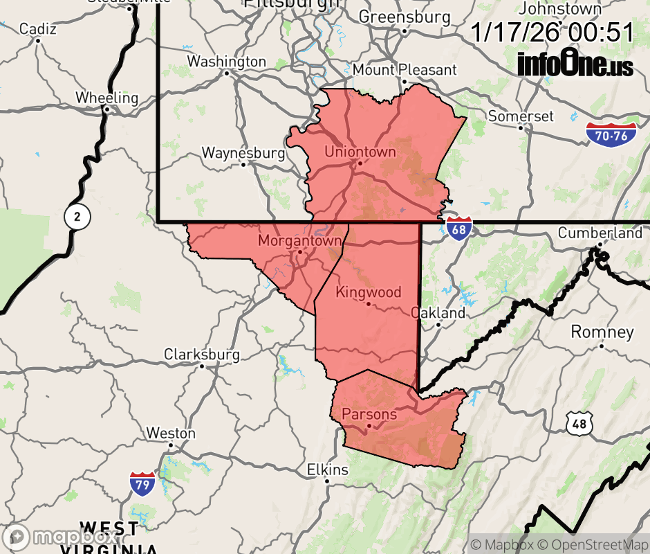 Canceled 1/17/26 12:20 PM Winter Weather Advisory issued January 17 at 12:49AM EST until January 17 at 7:00PM EST by NWS Pittsburgh PA * WHAT... Snow. Additional snow accumulations between 1 and 3 inches. * WHERE... Portions of southwest Pennsylvania and northern West Virginia. * WHEN... Until 7 PM EST this evening. * IMPACTS... Plan on slippery road conditions. ![]() |