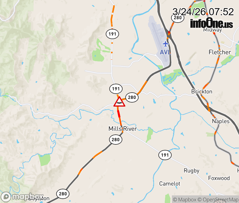 The shoulder is closed near NC-191, Old Haywood Road. Updated: Tue 3/24/26 7:52 AM EDT ![]() Updated: Tue 3/24/26 7:52 AM EDT |