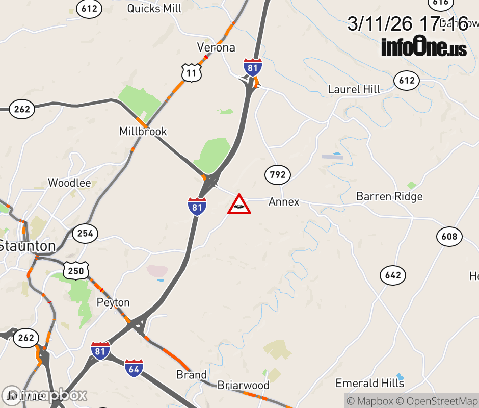 On VA-254 in the County of Augusta, in the vicinity of Annex Rd; Rt. 929N/S (Augusta County), motorists can expect delays due to a vehicle crash. All east lanes are closed. ![]() |