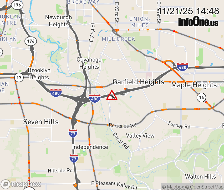 The right lane is blocked on I-480 East beyond I-77, due to debris on roadway. Updated: Fri 11/21/25 2:48 PM EST ![]() |
