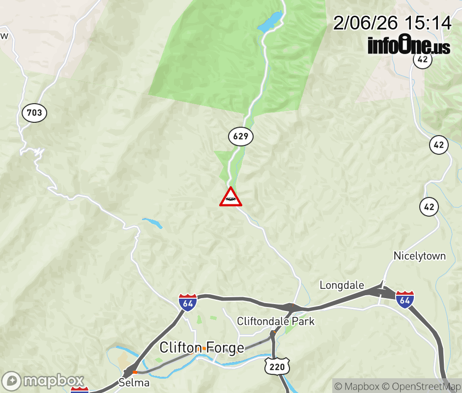 On Rt. 629 in the County of Alleghany, in the vicinity of Whisper Cir; Federal Property Boundary:FBDOUTHAT ST P, motorists can expect delays due to a tractor trailer crash. All north lanes are closed. All south lanes are closed. Updated: Fri 2/6/26 3:14 PM EST ![]() Updated: Fri 2/6/26 3:14 PM EST |