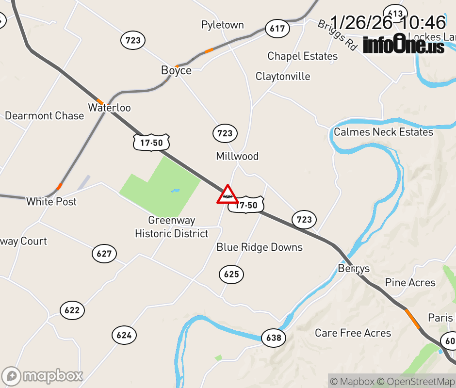 On VA-255 North in the County of Clarke, in the vicinity of John Mosby Hwy; US-50W, US-17N, motorists can expect delays due to a vehicle crash. ![]() |