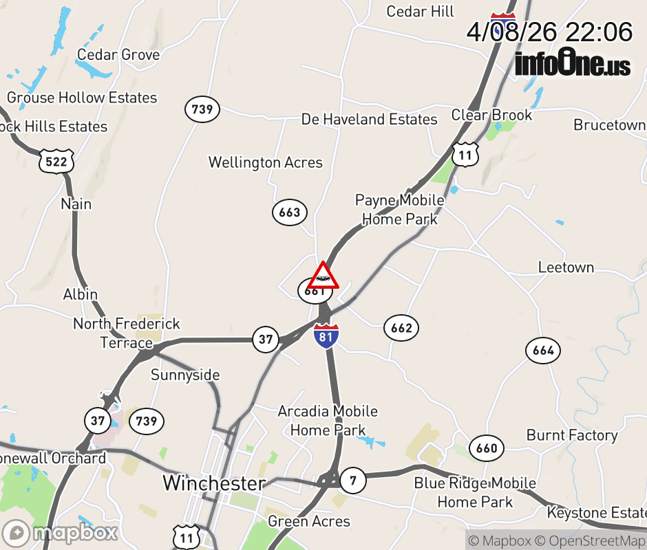 On I-81 at mile marker 318.3 in the County of Frederick, motorists can expect delays due to a tractor trailer crash. The south right shoulder is closed. ![]() |