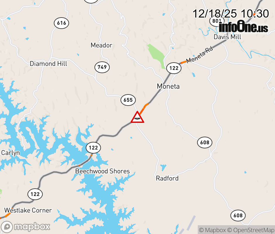 On Rt. 655 East in the County of Bedford, in the vicinity of Moneta Rd; VA-122N/S; / DIAMOND HILL RD, motorists can expect delays due to a vehicle crash. Lane closures exist. ![]() |