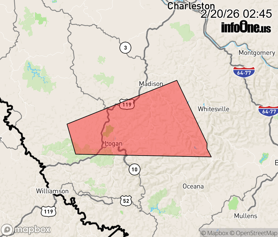 Canceled 2/20/26 2:56 AM Severe Thunderstorm Warning issued February 20 at 2:44AM EST until February 20 at 3:30AM EST by NWS Charleston WV SVRRLX The National Weather Service in Charleston West Virginia has issued a * Severe Thunderstorm Warning for... North central Mingo County in southern West Virginia... Central Logan County in southern West Virginia... Southern Boone County in central West Virginia... * Until 330 AM EST. * At 244 AM EST, a severe thunderstorm was located over Mount Gay-Shamrock, or near Logan, moving east at 50 mph. HAZARD...60 mph wind gusts and quarter size hail. SOURCE...Radar indicated. IMPACT...Hail damage to vehicles is expected. Expect wind damage to roofs, siding, and trees. * Locations impacted include... Madison, Logan, Chapmanville, Van, Holden, Chief Logan State Park, Mount Gay-Shamrock, Wharton, Bald Knob, Amherstdale-Robinette, West Logan, Mitchell Heights, Mount Gay, Verdunville, Blair, Dingess, Sharples, Jeffrey, and Switzer. This includes Route 119 between mile markers 24 and 47. ![]() |