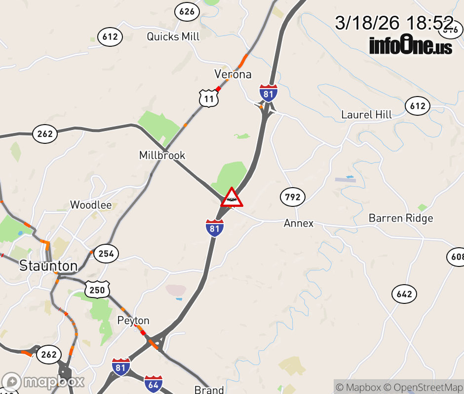 On I-81 at mile marker 225.7 in the County of Augusta, motorists can expect delays due to a multi-vehicle crash. The south right shoulder is closed. Updated: Wed 3/18/26 6:52 PM EDT ![]() Updated: Wed 3/18/26 6:52 PM EDT |