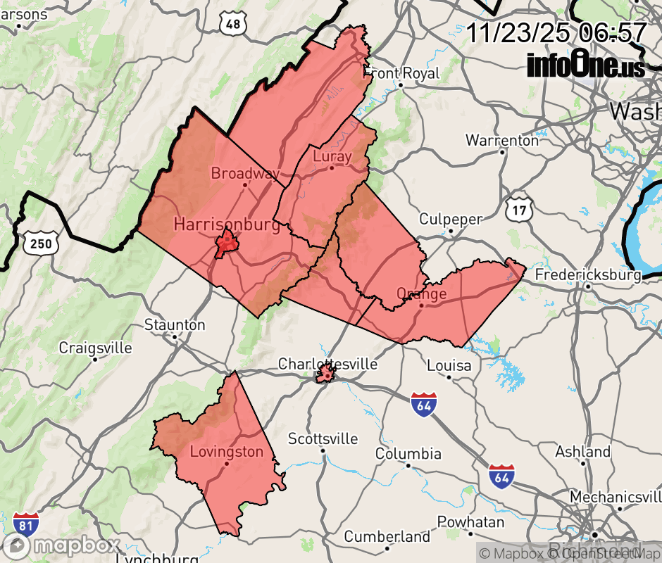 Canceled 11/23/25 1:00 PM Special Weather Statement issued November 23 at 6:55AM EST by NWS Baltimore MD/Washington DC Patches of dense fog have developed early this morning, especially in sheltered valley locations. This fog should lift through 8AM. Until then, visibility may be locally reduced to a quarter mile or less. Motorists should use extra caution, leave extra travel time and following distance, and use low beam headlights in fog. ![]() |