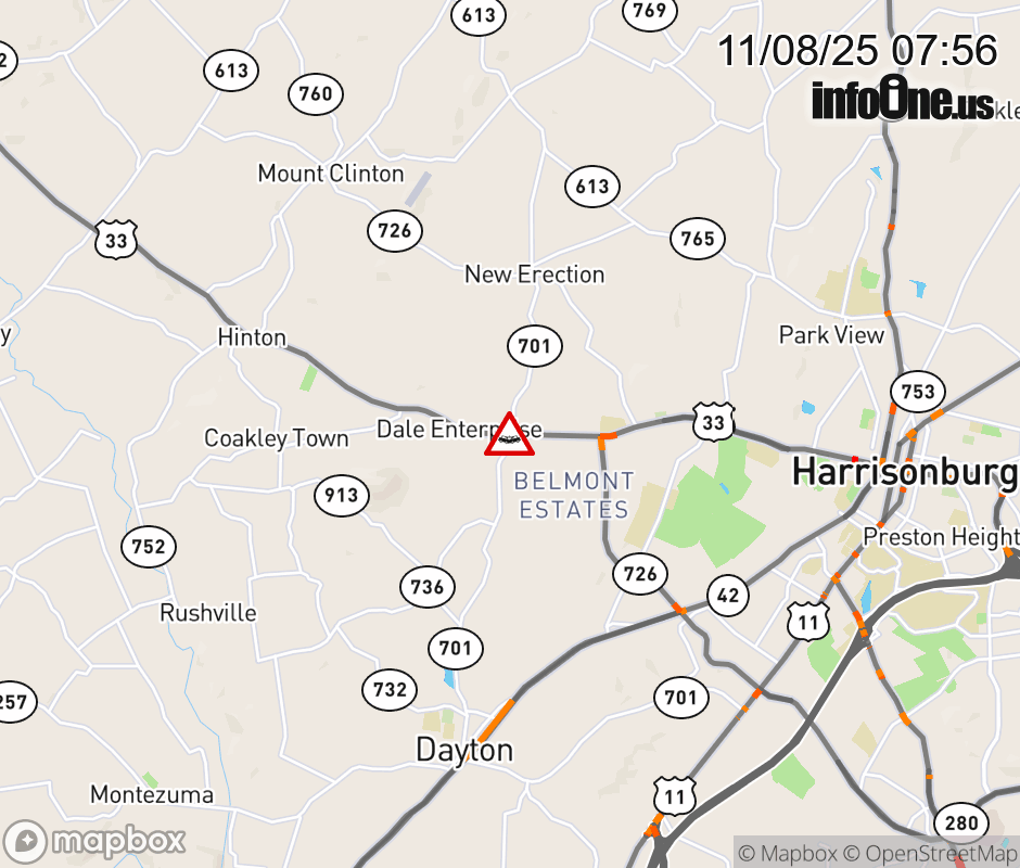 On US-33 East in the County of Rockingham, in the vicinity of Silver Lake Rd; Rt. 701N/S (Rockingham County);SILVER LAKE RD., motorists can expect delays due to a vehicle crash. Lane closures exist. ![]() |