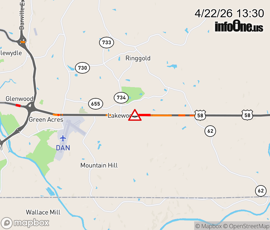 On US-58 in the County of Pittsylvania, in the vicinity of Gunn Garland Rd; Rt. 1024N/S (Pittsylvania County), motorists can expect delays due to a tractor trailer crash. All west lanes are closed. ![]() |