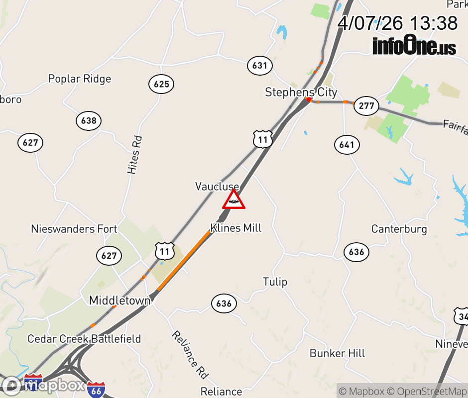 On I-81 South at mile marker 304.8 in the County of Frederick, motorists can expect delays due to a tractor trailer crash. Updated: Tue 4/7/26 1:38 PM EDT ![]() Updated: Tue 4/7/26 1:38 PM EDT |