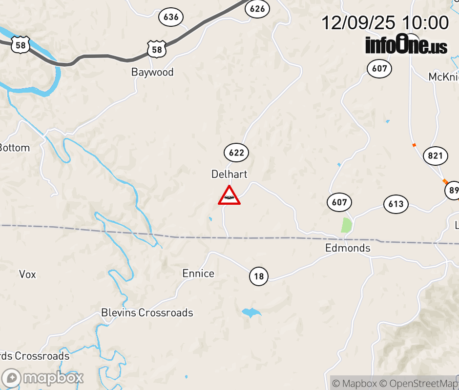 On Rt. 624 North in the County of Grayson, in the vicinity of Grouse Hollow Ln; Savannah Rd; Rt. 615E/W (Grayson County), motorists can expect delays due to a vehicle crash. Lane closures exist. Updated: Tue 12/9/25 10:00 AM EST ![]() |