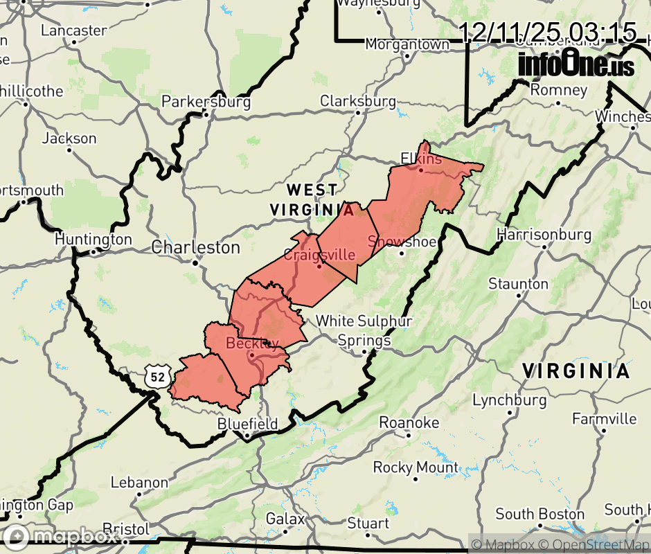 Canceled 12/11/25 9:47 AM Winter Weather Advisory issued December 11 at 3:13AM EST until December 11 at 10:00AM EST by NWS Charleston WV * WHAT... Snow expected. Snow accumulations up to one inch expected. Locally higher amounts possible. * WHERE... Portions of northeast, southeast, and southern West Virginia. * WHEN... Until 10 AM EST this morning. * IMPACTS... Plan on slippery road conditions. The hazardous conditions could impact the morning commute. * ADDITIONAL DETAILS... Radar and models show banding snowfall continuing across the coalfields and southern mountains of Virginia and West Virginia this morning. Locally higher amounts greater than one inch are possible for locations that receive persistent heavy bands of snowfall. ![]() |