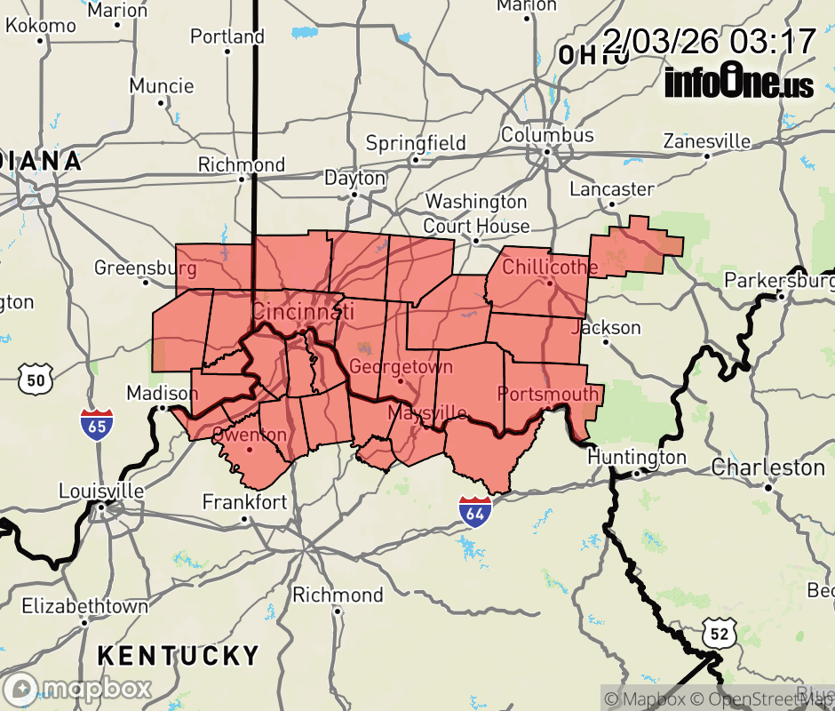 Canceled 2/3/26 10:51 AM Winter Weather Advisory issued February 3 at 3:15AM EST until February 3 at 10:00PM EST by NWS Wilmington OH * WHAT... Snow expected. Total snow accumulations between 1 and 3 inches, with locally higher amounts. * WHERE... Portions of southeast Indiana, northeast and northern Kentucky, and central, south central, and southwest Ohio. * WHEN... From 7 AM this morning to 10 PM EST this evening. * IMPACTS... Plan on slippery road conditions. The hazardous conditions could impact the Tuesday morning and evening commutes. ![]() |