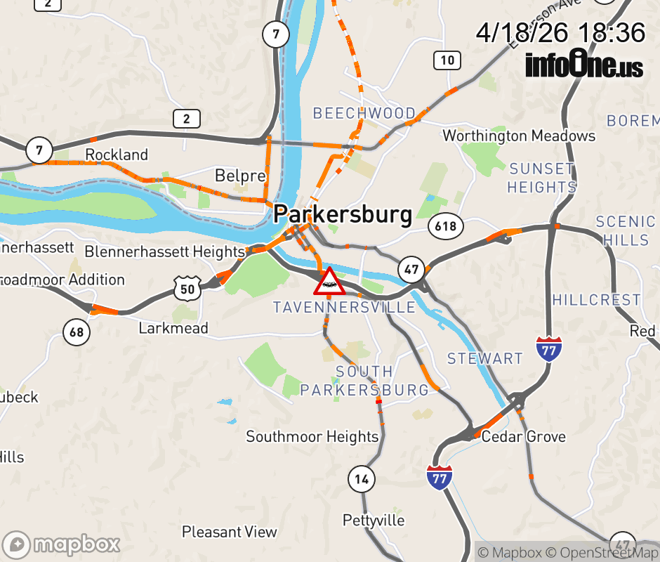 Vehicle Crash on WV-14 (Division St) & US-50 (Robert Byrd Hwy) on Parkersburg . Updated: Sat 4/18/26 6:36 PM EDT ![]() Updated: Sat 4/18/26 6:36 PM EDT |