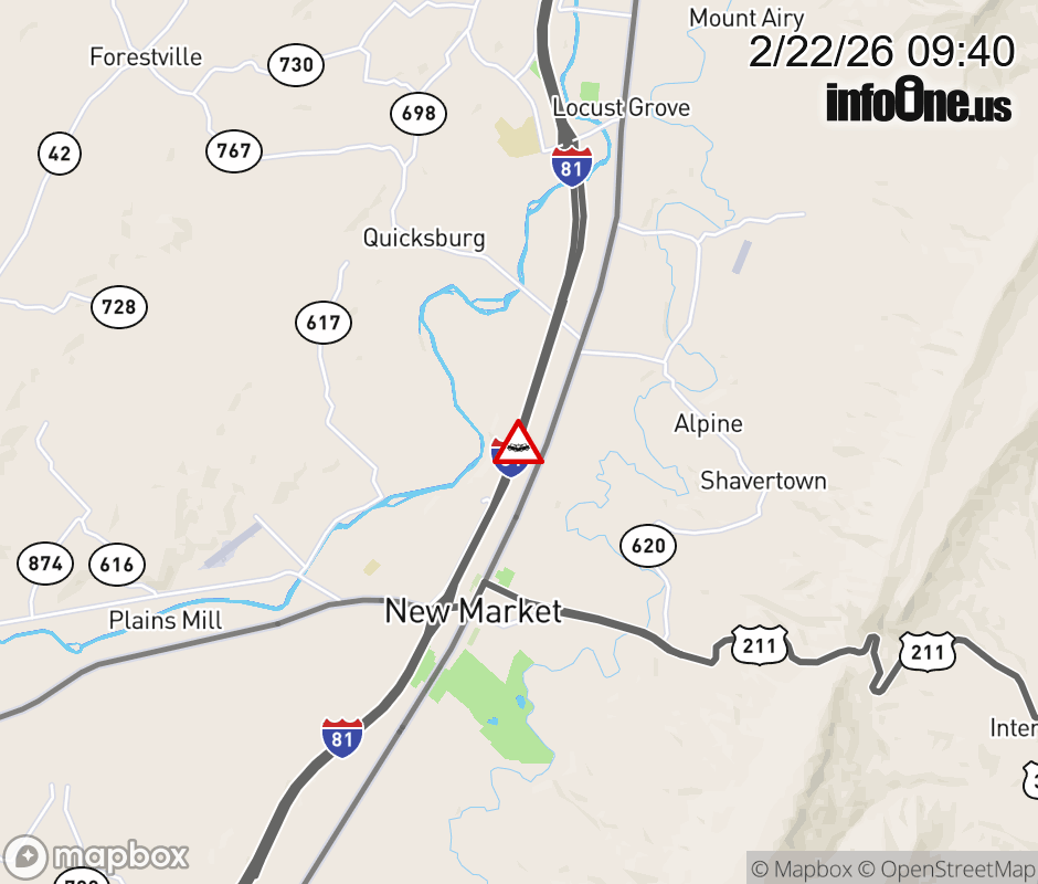 On I-81 at mile marker 266.5 in the County of Shenandoah, motorists can expect delays due to a tractor trailer crash. The north right shoulder is closed. Updated: Sun 2/22/26 9:40 AM EST ![]() Updated: Sun 2/22/26 9:40 AM EST |