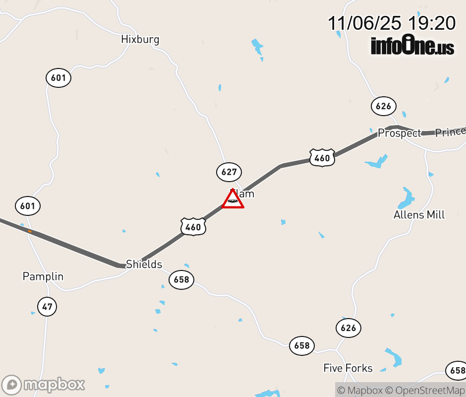On US-460 West in the County of Prince Edward, in the vicinity of Hixburg Rd; Rt. 627N/S (Prince Edward County), motorists can expect delays due to a vehicle crash. Lane closures exist. ![]() |