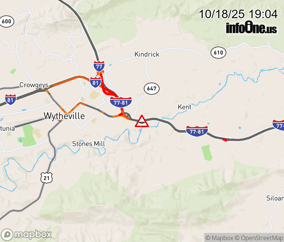 On I-81 North at mile marker 74.6 in the County of Wythe, motorists can expect delays due to a multi-vehicle crash. Traffic backups are approximately 0.5 mile. Updated: Sat 10/18/25 7:04 PM EDT ![]() Updated: Sat 10/18/25 7:04 PM EDT |