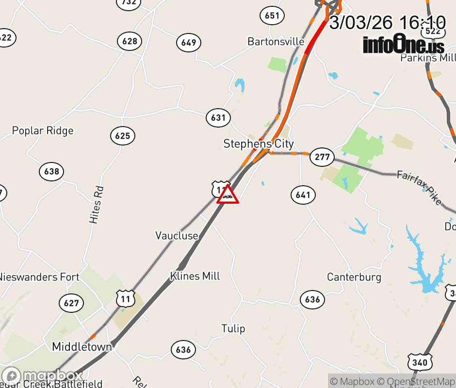 On I-81 South at mile marker 306 in the County of Frederick, motorists can expect delays due to a disabled vehicle. Traffic backups are approximately 3.0 miles. Updated: Tue 3/3/26 4:10 PM EST ![]() Updated: Tue 3/3/26 4:10 PM EST |
