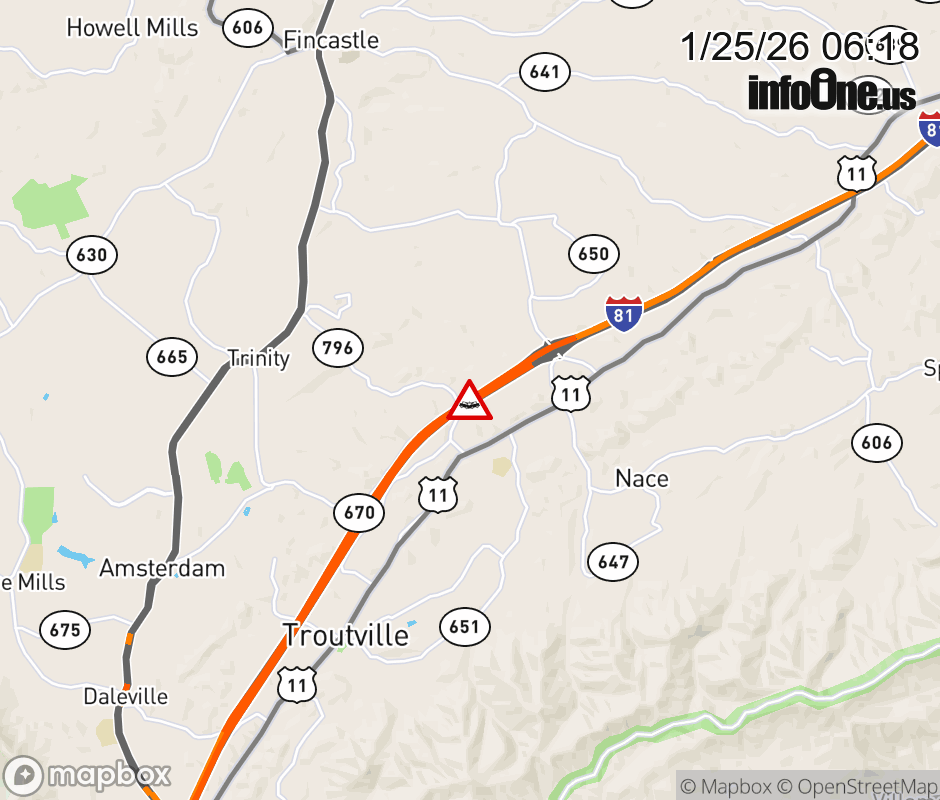 On I-81 at mile marker 155.4 in the County of Botetourt, motorists can expect delays due to a vehicle crash. The south right shoulder is closed. Updated: Sun 1/25/26 6:18 AM EST ![]() Updated: Sun 1/25/26 6:18 AM EST |