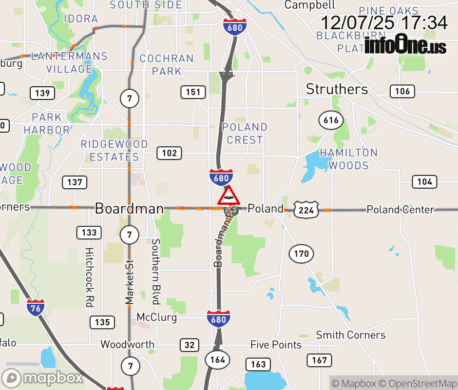 The 2 left lanes are blocked on I-680 South at US-224 West/Canfield, due to a crash. ![]() |